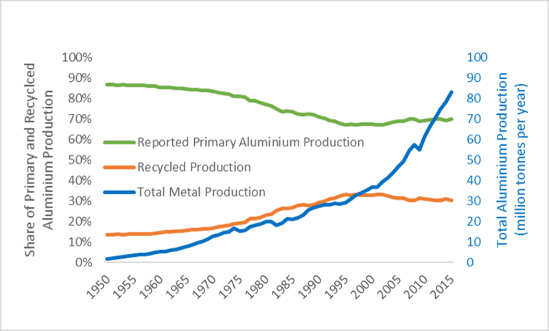 Recycled aluminium produced from traded new scrap and old scrap as a percentage of aluminium available from new and old scrap sources.